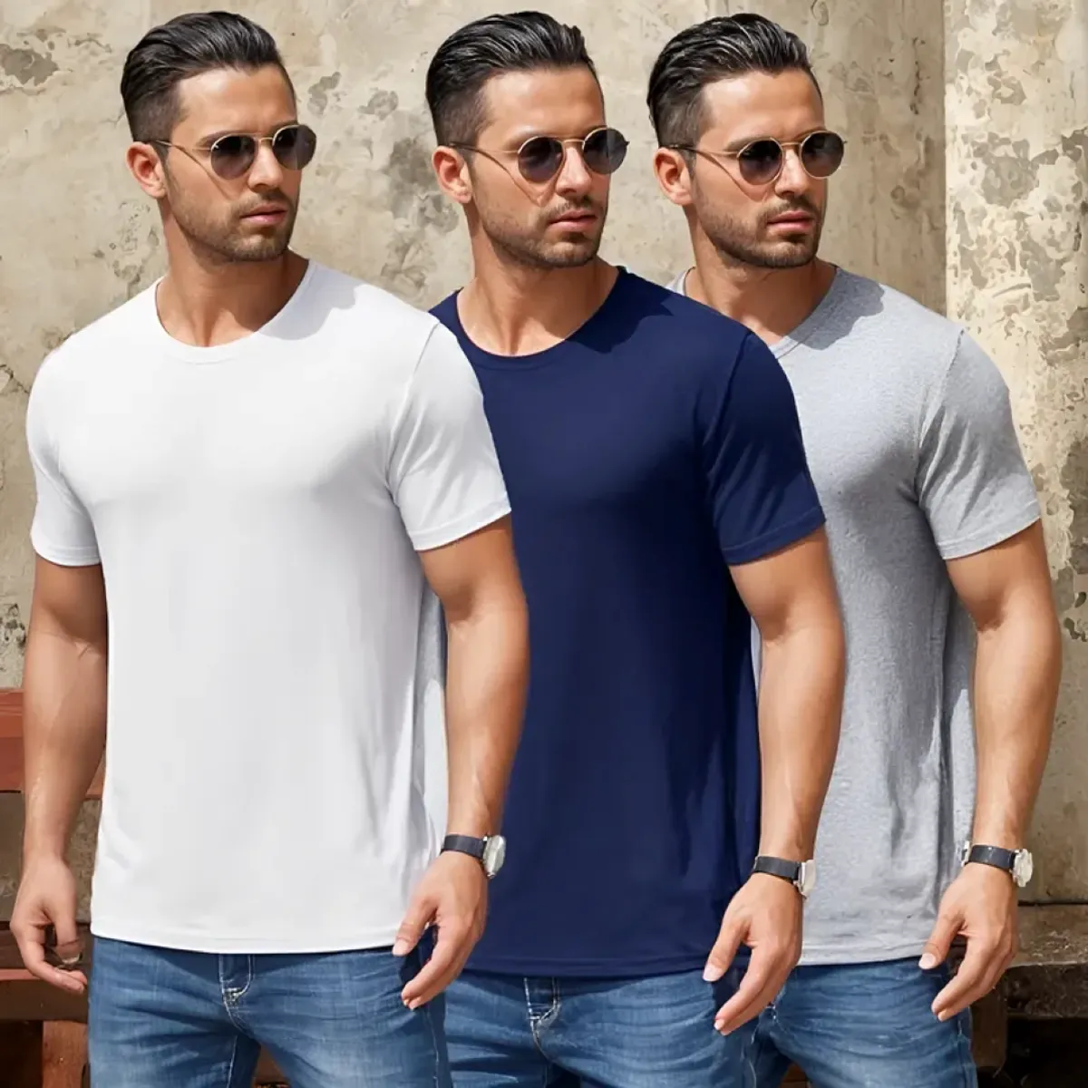 COMBO DE 3 CAMISETAS CUELLO REDONDO PARA HOMBRE HECHAS EN ALGODÓN PEINADO Y SUAVIZADO DE ALTA CALIDAD Blanca, Azul Oscuro y Gris Jaspe